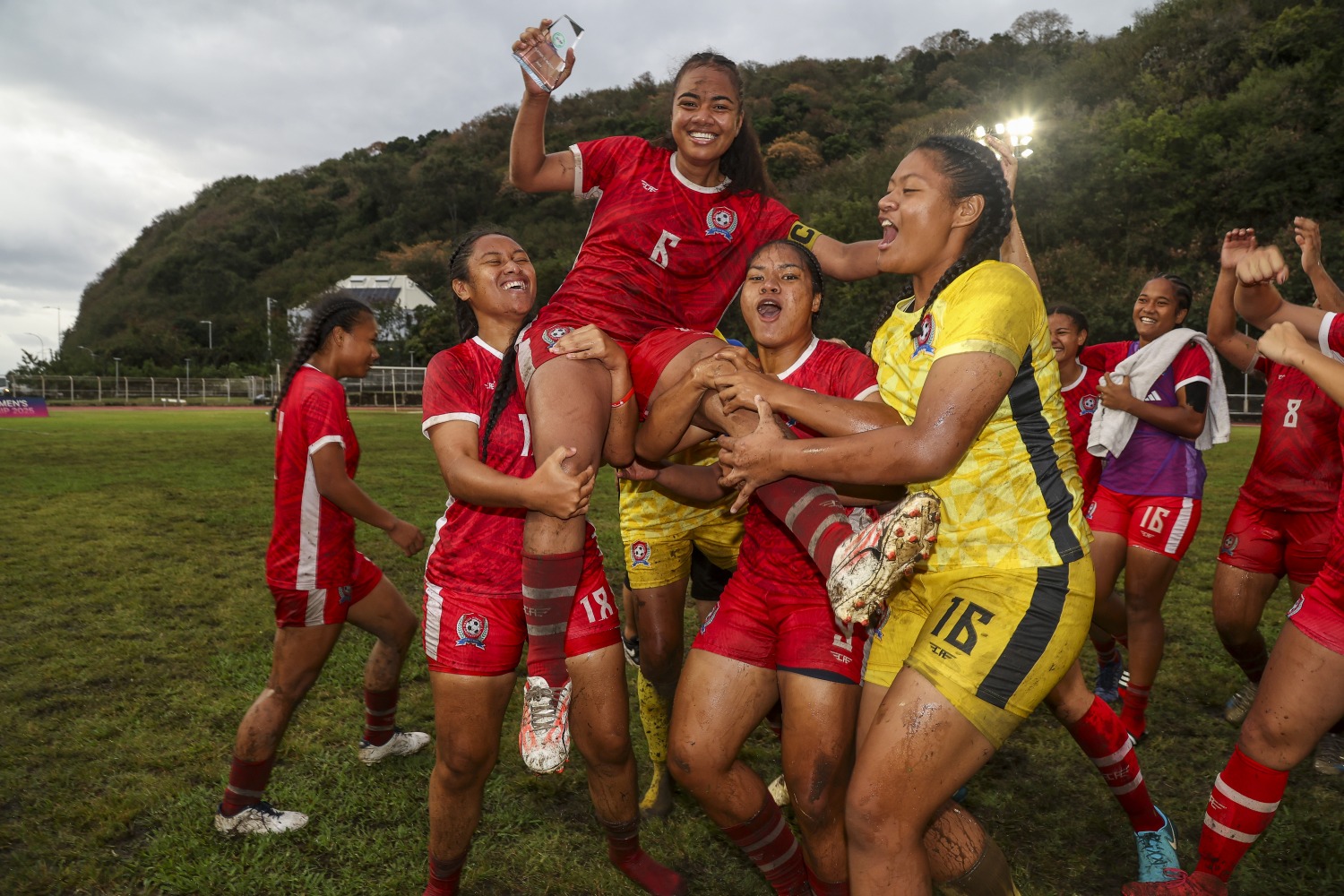 Sous pression, les Tahitiennes finissent par céder à la 25ᵉ minute : la capitaine tongienne Tamaa Faletau ouvre le score. Juste avant la pause, elle s’offre un doublé et donne une avance confortable à son équipe (2-0).